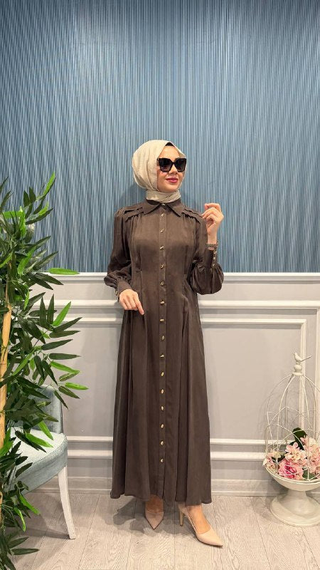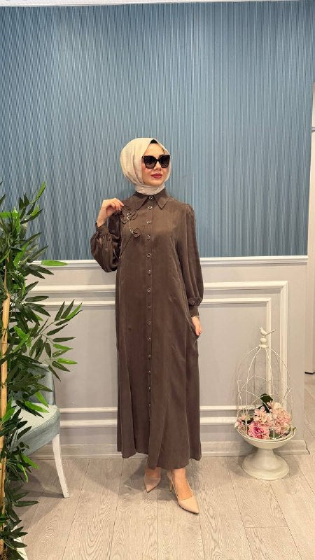 SATEN KUPRA YAKASI VE KOLLARI YAPRAK DÜĞMELİ ELBİSE