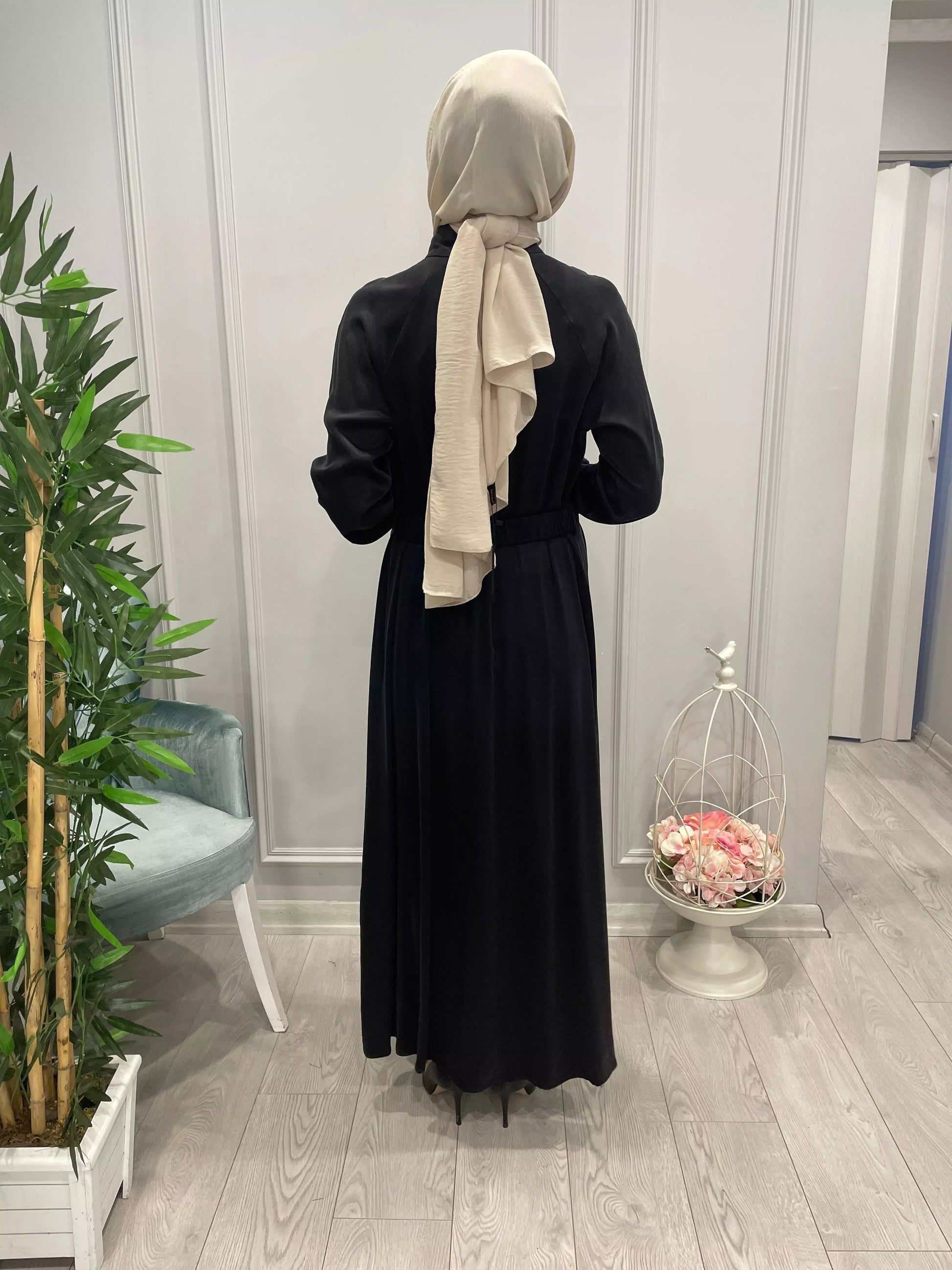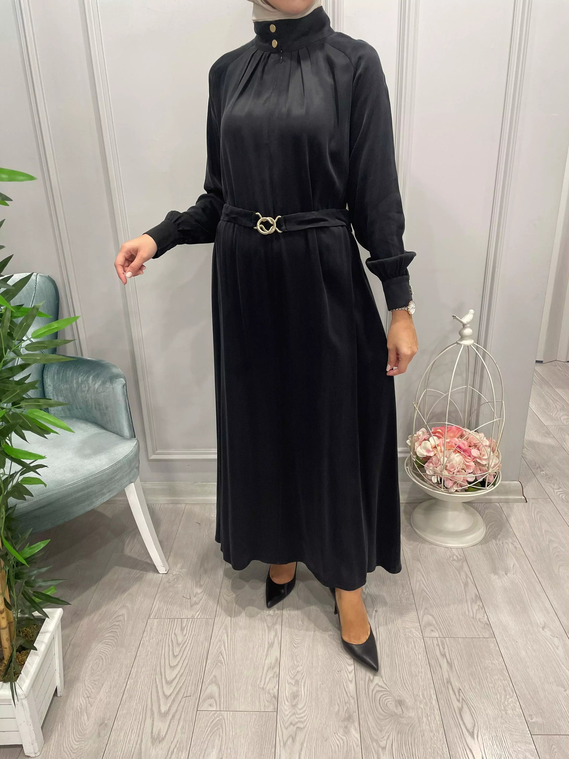 DİK YAKA BELİ KUŞAKLI SATEN İPEK ELBİSE