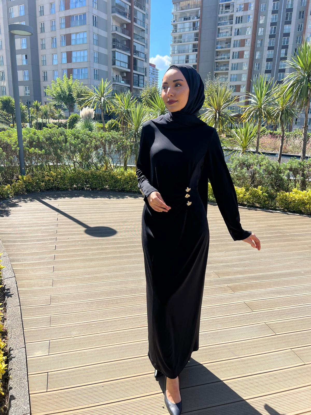 Siyahın zarif duruşunu, bel kısmındaki drape detayları ve altın düğmeler mükemmel şekilde tamamlamış. Uzun kollu ve düz kesimiyle hem zarif hem de vücuda oturan bir siluet oluşturuyor.