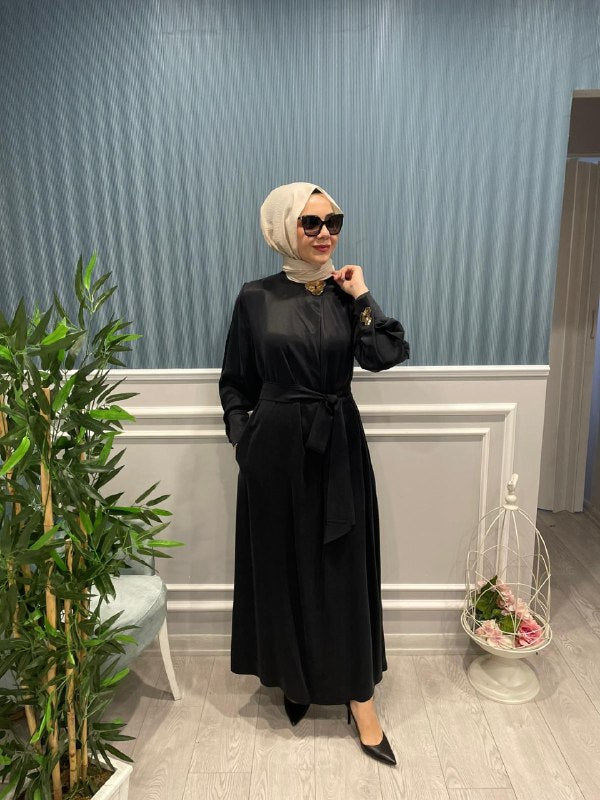 Düz Renk Cupra İpek Yaka ve Kol Aksesuar detaylı zarifliğiyle şıklığı tamamlayan  bel kısmındaki kuşak detayıyla vücut hatlarını vurgulayan şahane bir elbise