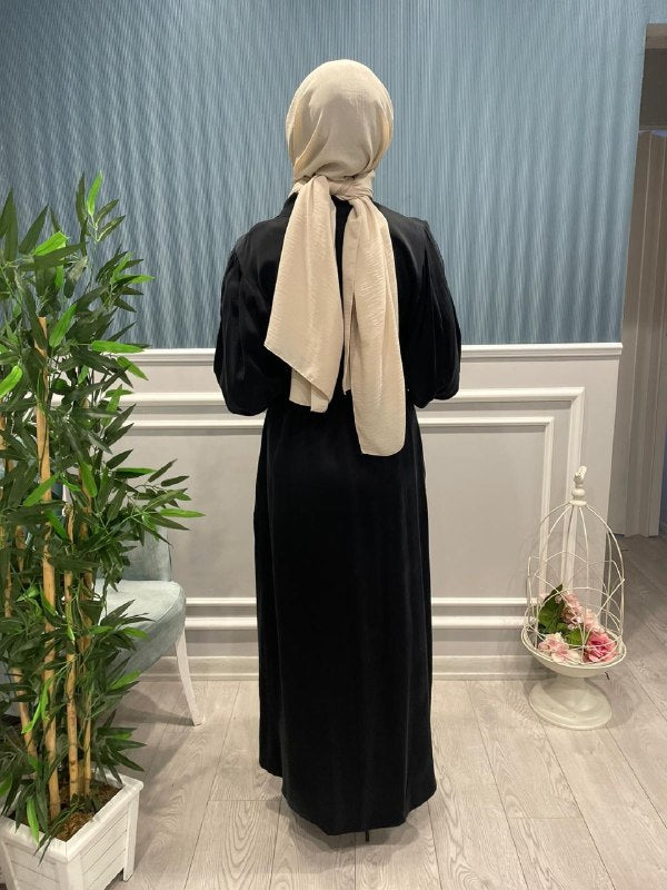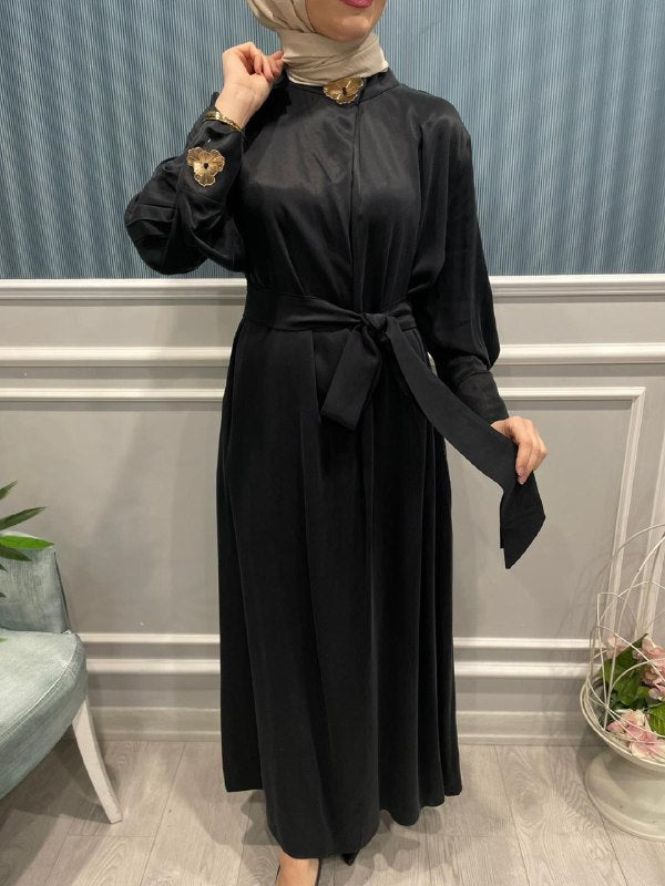 SATEN KUPRA YAKASI VE KOLLARI YAPRAK DÜĞMELİ ELBİSE