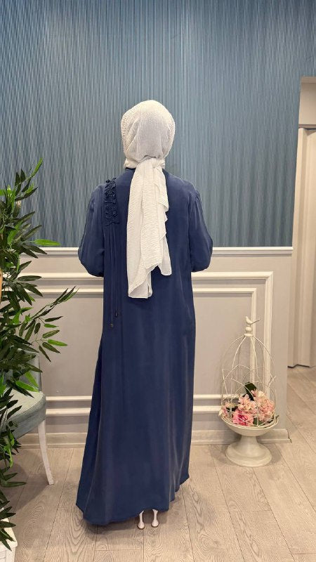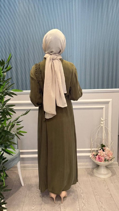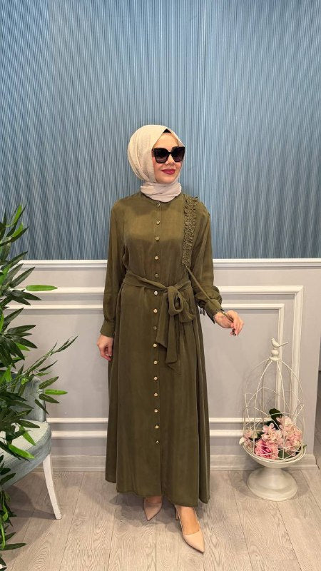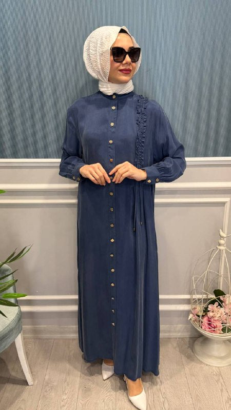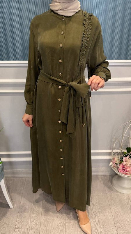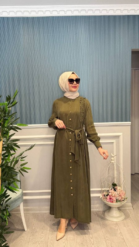 TEK TARAFI BİYE VE BÜZGÜ DETAYLI ASTARLI ELBİSE